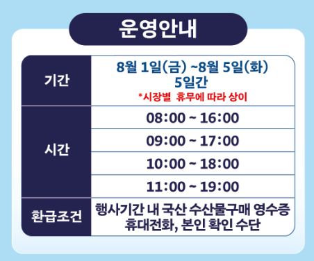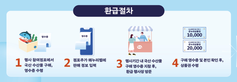 소비자는 행사 기간 중 참여시장 내에서 환급을 희망하는 소비자는 국내산 수산물을 구매한 후 영수증을 현장에 마련된 환급 창구에 제출하면 됩니다.