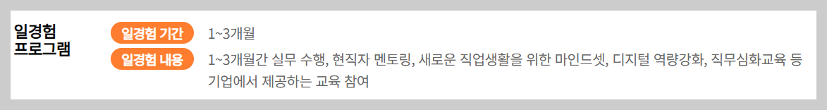 - 일경험 운영(1~3개월): 실무수행, 멘토링, 직무·디지털 교육 이수