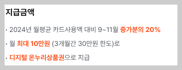 지급금은 2024년 월평균 카드 사용액 대비 9~11월 증가분의 20%입니다.