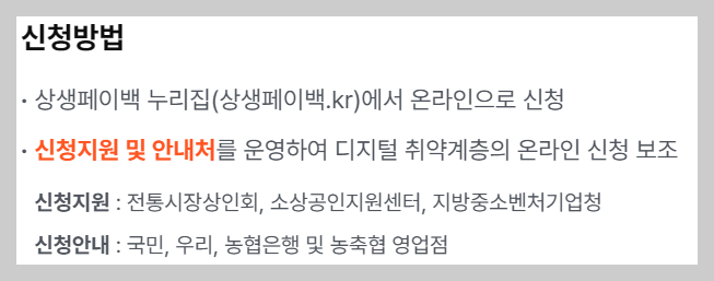 - 신청지원 기관: 전통시장상인회, 소상공인지원센터, 지방중소벤처기업청