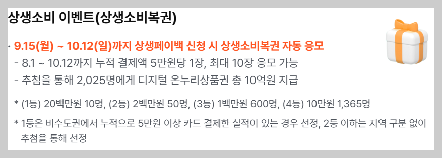 | 상생소비복권 응모 | 9월 15일(월) ~ 10월 12일(일) | 상생페이백 신청 시 자동 응모 |