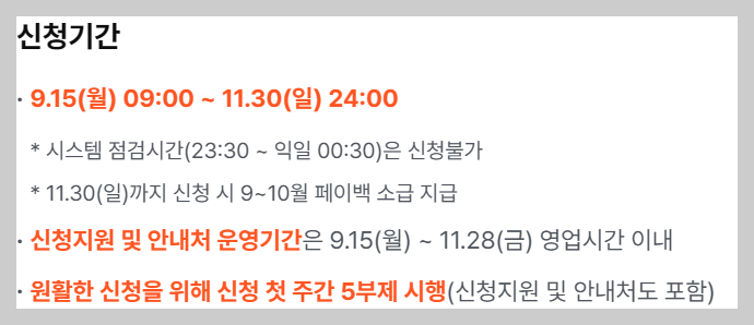 | 신청기간 | 9월 15일(월) 09:00 ~ 11월 30일(일) 24:00 | 11월 30일까지 신청 시 9~10월 페이백 소급 |