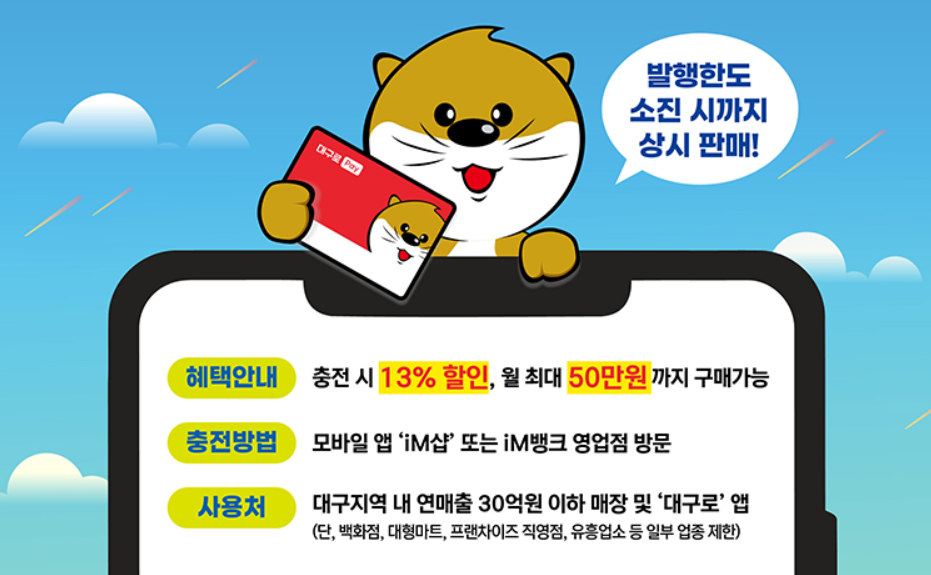 충전은 모바일 앱 ‘iM샵’에서 9월 1일 00시 15분부터 가능하고, 오프라인에서는 iM뱅크 영업점 운영 시간 내에 충전할 수 있습니다. 개인별 월 구매 한도는 기존과 동일하게 50만 원으로 유지됩니다.