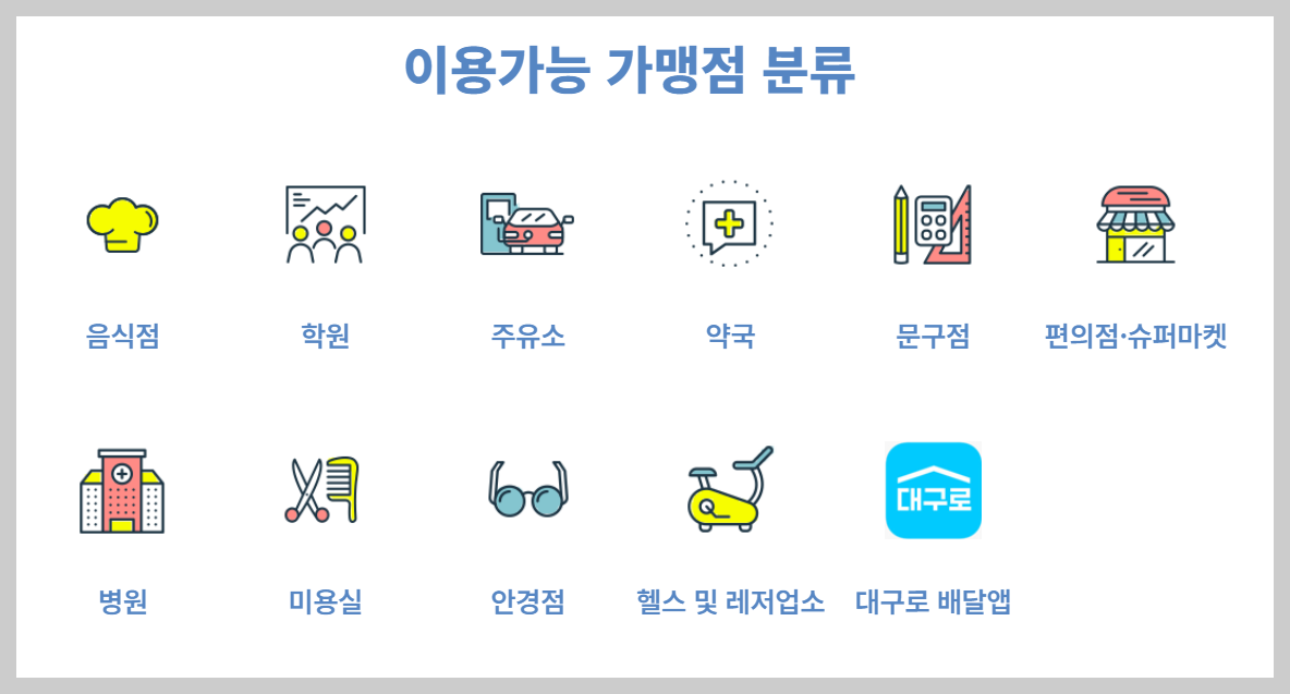 | 교육·문화 | 학원(어학·예체능 등), 서점, 문화센터, 키즈카페 | 수강료·도서 구입 등, 시설별 가맹 여부 상이 |