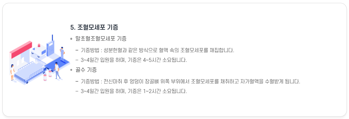 - 회복: 채취가 완료되면 중심정맥관을 제거하고 안정을 취한 후 퇴원합니다. 기증자의 몸은 몇 주 내에 정상적인 조혈모세포 생산 기능을 회복합니다.
