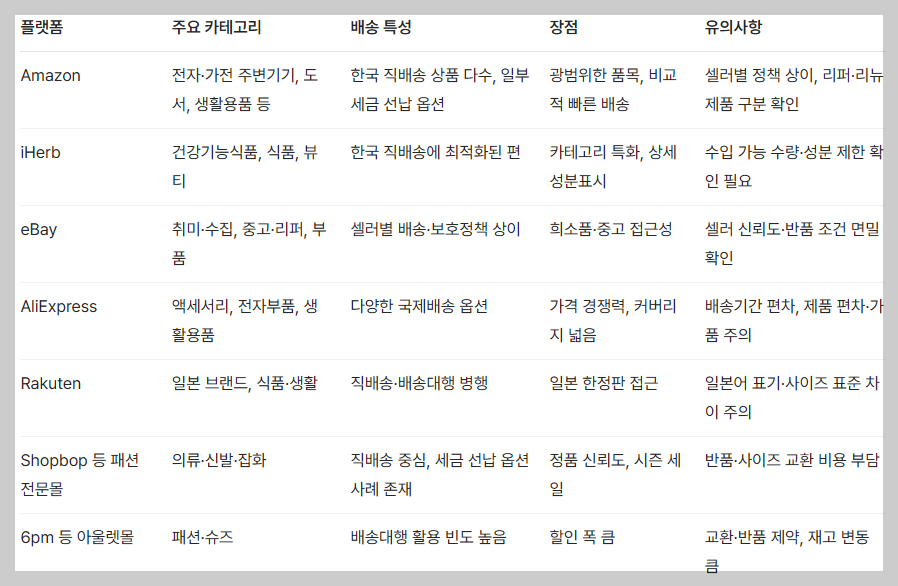 강점: 품목 다양성, 한국 직배송 상품 다수, 세금 선납(DDP) 옵션 사례, 고객지원 체계적.