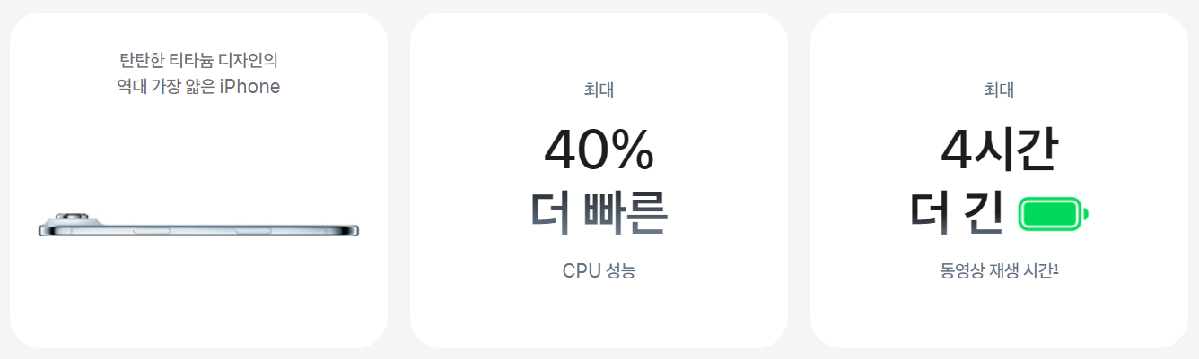- 배터리 공간 최적화: 두께를 혁신적으로 줄이면서도 배터리 공간을 극대화하여 실제 배터리 수명을 최대한 늘렸습니다. 애플의 정교한 설계 기술이 돋보이는 부분입니다.