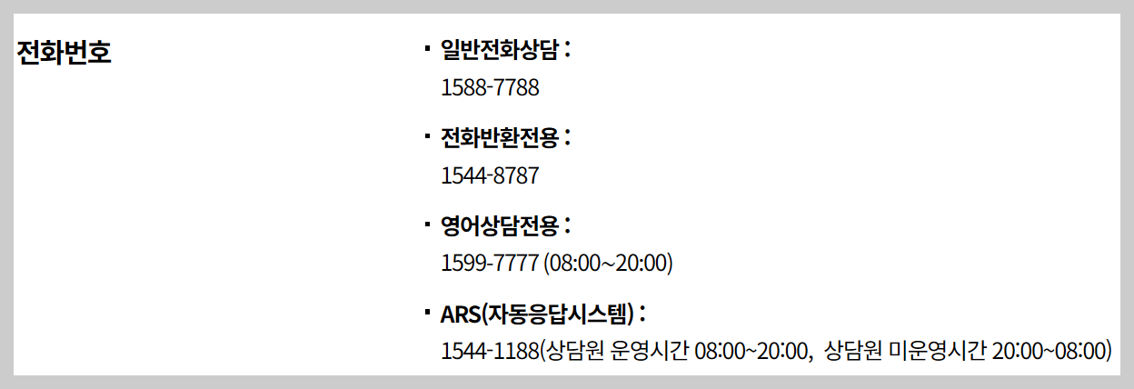 - 이용 시간: ARS : 00:00∼24:00(상담원 운영시간 08:00~20:00, 상담원 미운영시간 20:00~08:00)