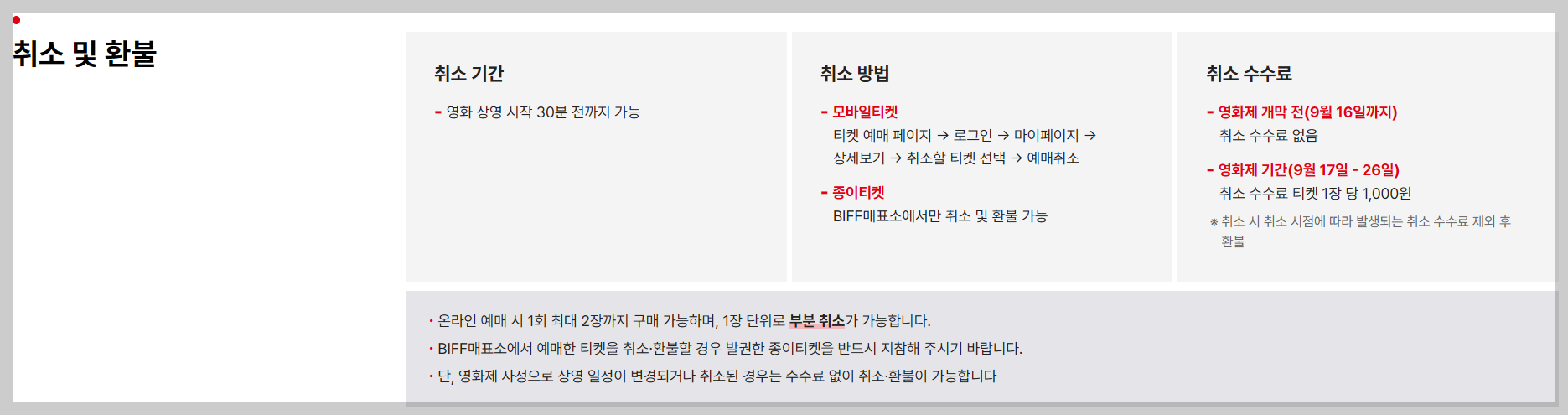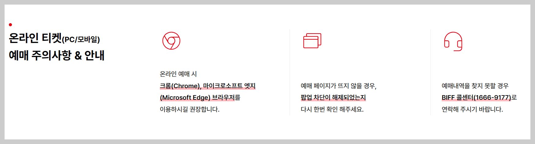 ※ 온라인 예매로 매진되지 않거나 취소표가 발생한 경우에는 영화제 기간에 BIFF매표소에서 티켓 예매가 가능합니다.