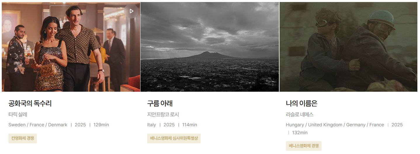 아이콘 (Icons): 동시대를 대표하는 거장들의 신작을 소개하는 섹션으로, 총 33편의 작품이 소개됩니다. 작년보다 16편 확대된 규모로, 세계 영화계를 이끄는 각국 감독들의 고유한 미학과 서사를 통해 깊이 있는 영화적 사유를 경험할 수 있습니다.