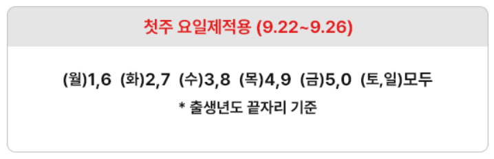 - 신청·지급 첫 주 요일제 적용: 혼잡을 줄이고 원활한 신청을 위해 신청 시작 첫 주(9월 22일~28일)에는 출생연도 끝자리에 따른 요일제가 적용될 예정입니다. 반드시 확인하시고 해당 요일에 맞춰 신청해 주시길 바랍니다. 첫 주 이후에는 요일제와 상관없이 자유롭게 신청하실 수 있습니다.