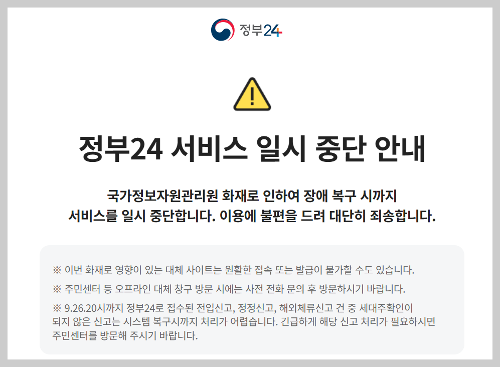 2025년 9월 26일, 국가 핵심 전산망의 심장부라 불리는 대전 국가정보자원관리원(이하 국정자원)에서 안타까운 화재가 발생하였습니다. 이 사고는 전 국민이 이용하는 다양한 정부 서비스 및 행정 시스템에 일시적인 장애를 초래하며 사회 전반의 큰 우려를 자아냈습니다.