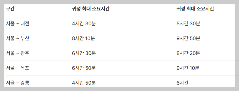 국토부가 제시한 주요 구간별 최대 소요시간(귀성 기준)은 다음과 같습니다. 지역별·시간대별 교통상황 및 기상여건에 따라 변동될 수 있으므로 계획 시 여유 시간을 확보하시기 바랍니다.