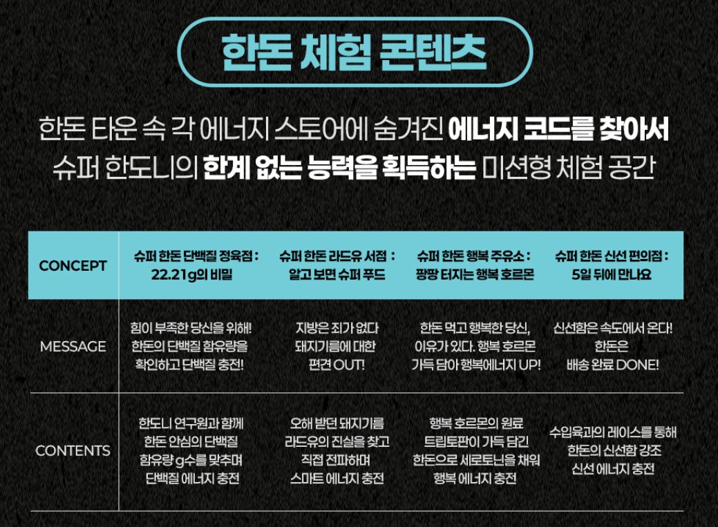 - 한돈 에너지 스토어존: 한돈의 영양학적 우수성과 건강함을 알리는 공간입니다.