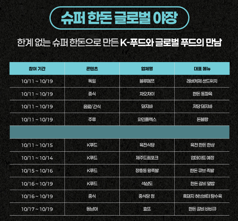 야외 공간은 '슈퍼 한돈 글로벌 야장'으로 변신하여, 관람객의 입맛을 돋우는 미식의 장이 펼쳐집니다. 취식과 휴식을 동시에 즐길 수 있는 야외 포차존에서는 남녀노소 모두가 즐길 수 있는 다채로운 '글로벌 한돈 요리'를 제공합니다. 신선한 가을바람을 맞으며 맛있는 한돈 요리와 함께 즐거운 시간을 보낼 수 있는 이상적인 공간이 될 것입니다.