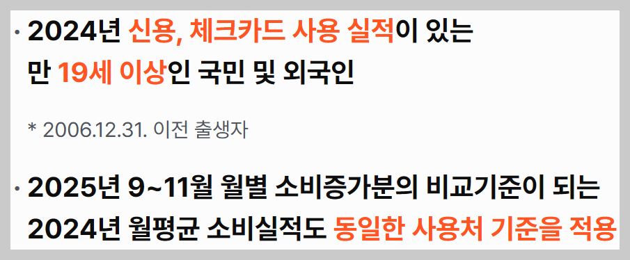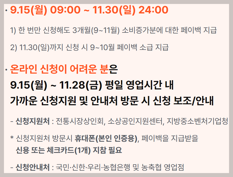 신청 대상은 2024년 신용 또는 체크카드 사용 실적이 있는 만 19세 이상 (2006년 12월 31일 이전 출생자) 대한민국 국민 및 외국인입니다. 상생페이백 신청은 2025년 9월 15일(월) 09:00부터 2025년 11월 30일(일) 24:00까지 상생페이백 누리집에서 온라인으로 할 수 있습니다. 신청 첫 주에는 원활한 신청을 위해 출생연도 끝자리에 따른 5부제가 시행되었습니다.