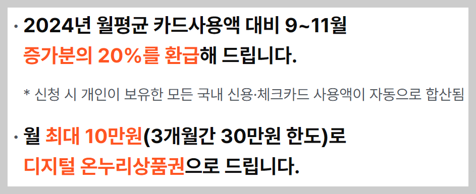 지급 금액은 2024년 월평균 카드 사용액 대비 2025년 9월에서 11월까지의 월별 증가분 20%이며, 월 최대 10만원, 총 3개월간 최대 30만원 한도로 디지털 온누리상품권으로 지급됩니다. 예를 들어, 9월 사용분에 대한 페이백은 10월 15일에 지급되며, 10월과 11월 사용분은 각각 다음 달 15일에 지급됩니다. 페이백으로 지급된 상품권의 유효기간은 지급일로부터 5년간입니다.