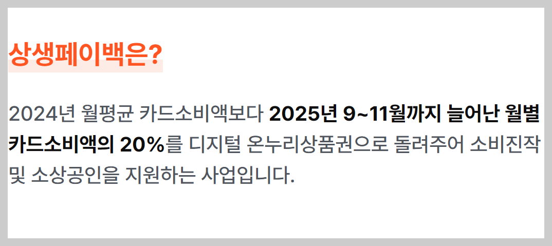 상생페이백은 2024년 월평균 카드 소비액 대비 2025년 9월부터 11월까지의 월별 소비액 증가분의 20%를 디지털 온누리상품권으로 환급해 주는 사업입니다. 이는 소비자들이 신용 및 체크카드 사용을 통해 지역 소상공인을 돕고, 동시에 경제적인 혜택도 받을 수 있도록 설계된 정책입니다.