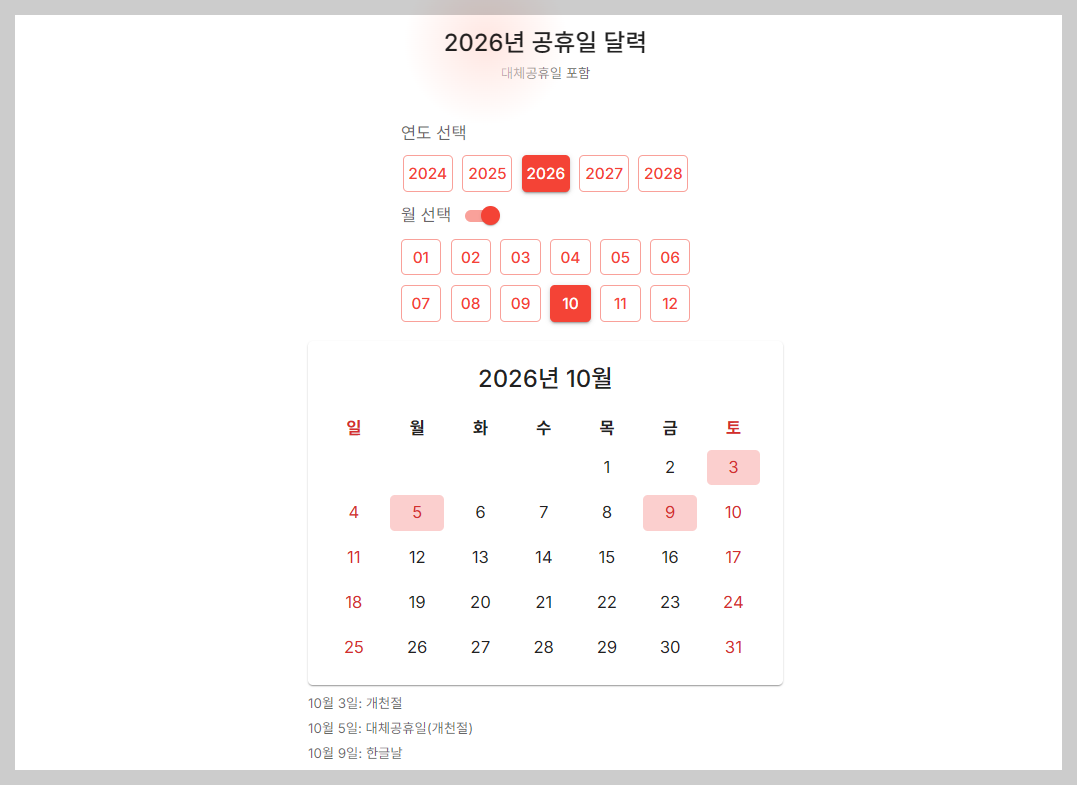 | 10월 5일 (월) | 대체공휴일 (개천절) | 3일 연휴 형성 |