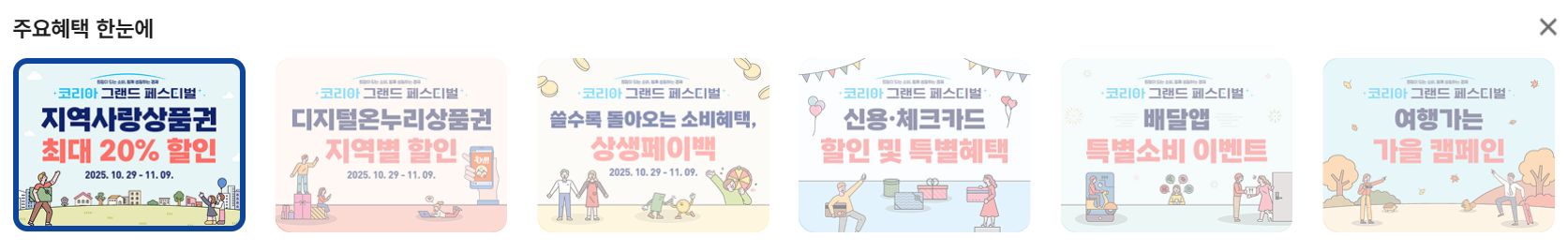 전국 소비축제를 한눈에! 국가단위 대규모 소비축제 ‘코리아 그랜드 페스티벌’의 부처별 할인행사, 기획전, 이벤트 정보를 한 곳에서 확인할 수 있는 통합 홈페이지입니다.