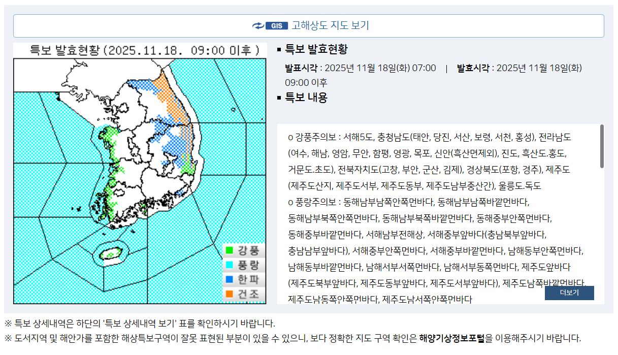> 예보정보 > 월간예보 기상특보 : - 2025-11-18 09:00:00 o 강풍주의보 : 서해5도, 충청남도(태안, 당진, 서산, 보령, 서천, 홍성), 전라남도(여수, 해남, 영암, 무안, 함평, 영광, 목포, 신안(흑산면제외),
