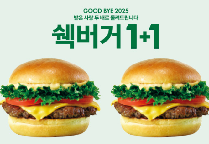 안녕하십니까? 쉐이크쉑은 다가오는 2025년 연말을 맞이하여, 한 해 동안 변함없이 쉐이크쉑을 사랑해주신 고객의 성원에 보답하고자 이번 '쉑버거 1+1 이벤트'를 마련했습니다. 따라서 쉐이크쉑의 시그니처 메뉴인 쉑버거를 더욱 풍성하고 합리적인 가격으로 즐기실 수 있습니다. 연말연시, 소중한 분들과 함께 따뜻하고 즐거운 미식 경험을 나누시기를 바랍니다. 본 안내문을 통해 이벤트의 상세 내용을 확인하시고 많은 참여 부탁드립니다.