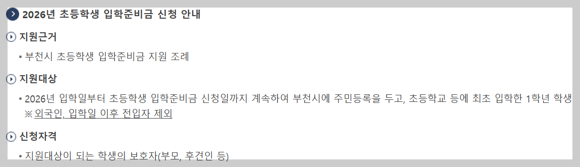 - 지원 대상: 부천시 주민등록 학생 중 초등 1학년 신입생