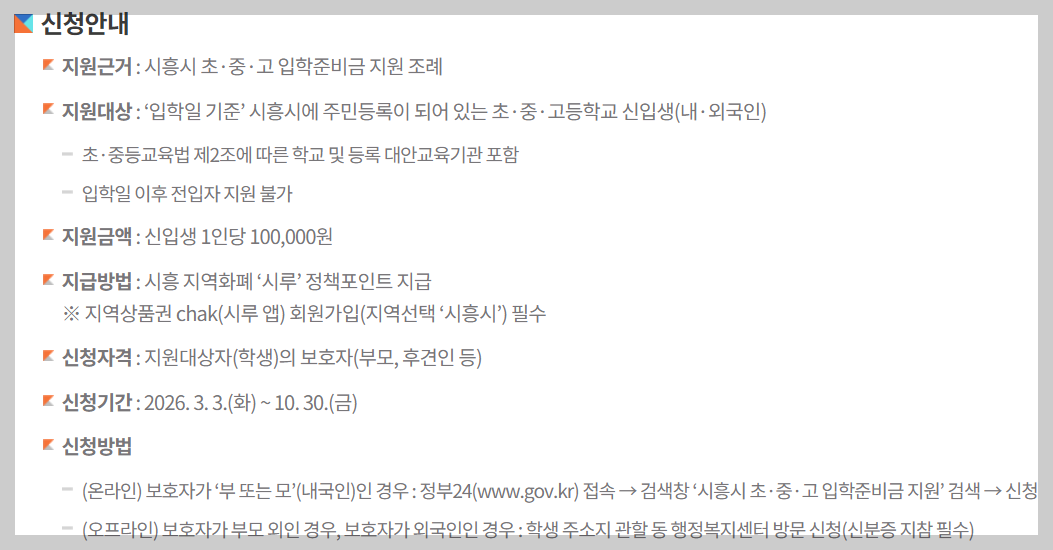 | 경기 시흥시 | 관내 주민등록 초·중·고 신입생(외국인 포함) | 10만원 | 3/3~10/30 | 정부24 온라인, 동 행정복지센터 방문 신청 | 지역화폐 모바일 ‘시루’ | 입학 준비 물품 구매 가능, 병원·약국 등 사용 불가 |