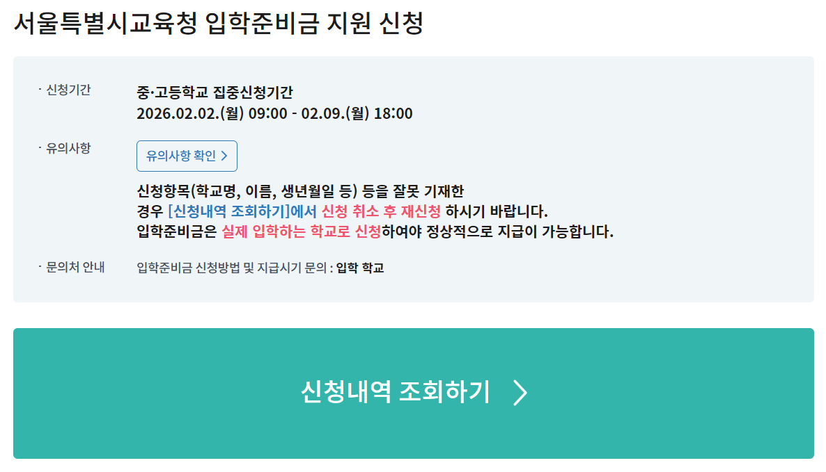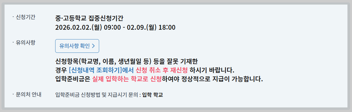 - 중·고등학교 신입생: 2월 2일 ~ 2월 9일 (입학준비금 신청 누리집 이용, 오전 9시 ~ 오후 6시)