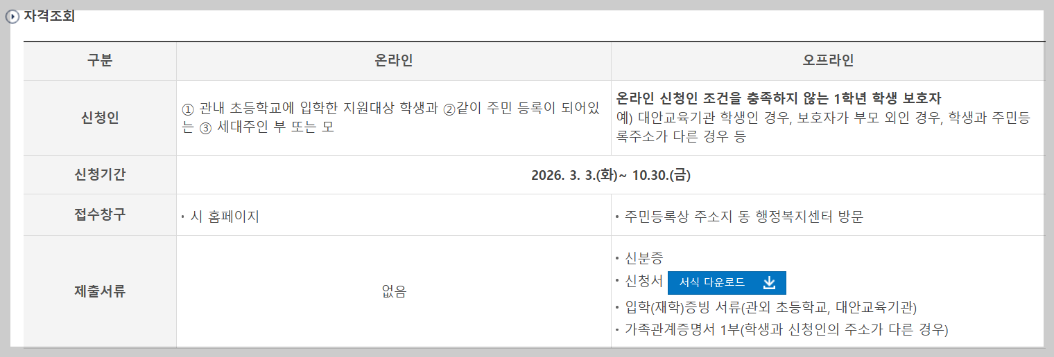 - 신청 방법: 온라인(부천시 홈페이지) – 관내 초등학생 부모 세대주만 가능, 그 외 보호자나 대안기관 학생은 주소지 동 행정복지센터 방문 오프라인 신청