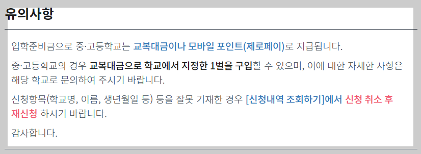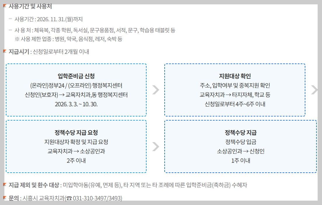 - 사용 가능 품목: 문구류, 서점, 체육복, 학원 등 입학 관련 준비 물품 구매