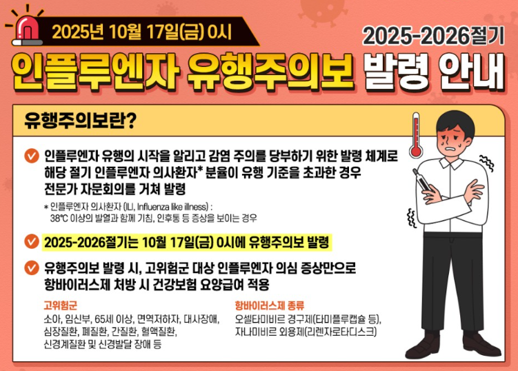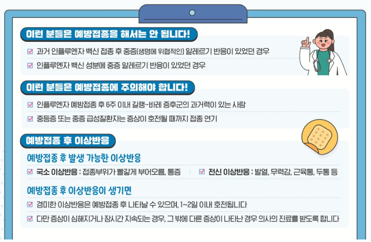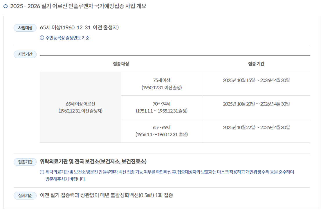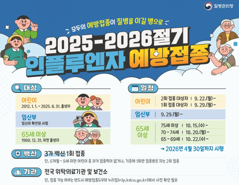 질병관리청에서는 2025-2026절기 인플루엔자(독감) 예방접종을 국가예방접종 사업으로 실시하고 있으며, 특히 65세 이상 어르신, 생후 6개월부터 13세까지 어린이, 그리고 임신부를 대상자로 정하여 무료로 접종을 지원하고 있습니다.
