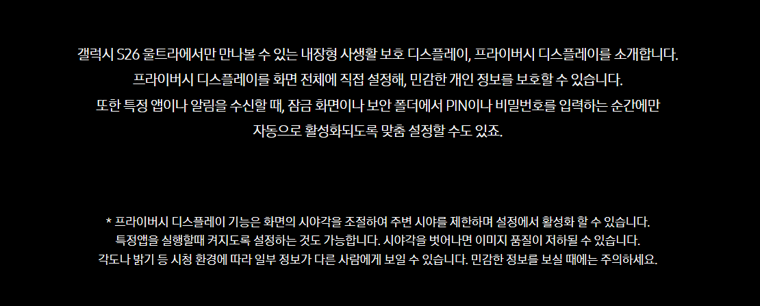 기존에는 사생활 보호 필름을 별도로 부착해야 했지만 화면 밝기가 낮아지거나 화질이 저하되는 문제가 있었습니다. 반면 갤럭시 S26 울트라는 디스플레이 자체 기술로 시야각을 제한하기 때문에 선명한 화질을 유지하면서도 개인정보 보호 기능을 제공할 수 있습니다. 특히 금융 앱이나 메시지 알림, 비밀번호 입력 시 자동으로 기능이 활성화되도록 설정할 수 있어 공공장소에서도 보다 안전하게 스마트폰을 사용할 수 있습니다.