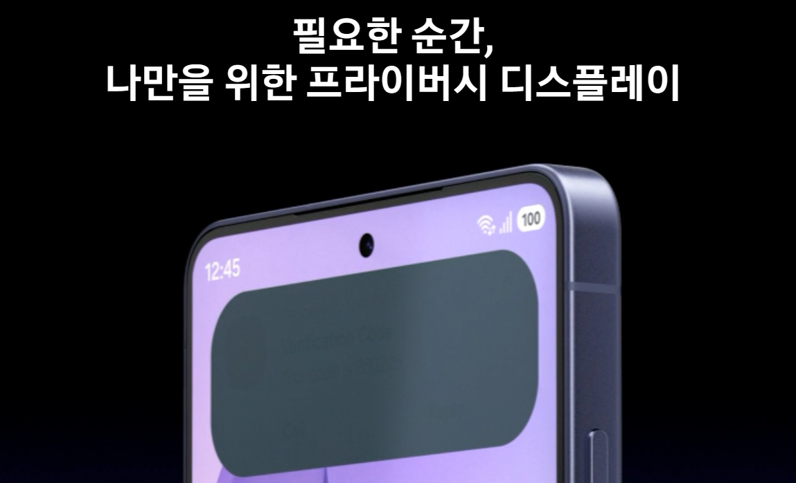 갤럭시 S26 울트라에서 가장 주목받는 기술은 ‘프라이버시 디스플레이’입니다. 이 기술은 디스플레이 픽셀에서 나오는 빛의 확산 방향을 제어해 정면에서는 선명하게 보이지만 측면에서는 화면 내용을 확인할 수 없도록 설계되었습니다.