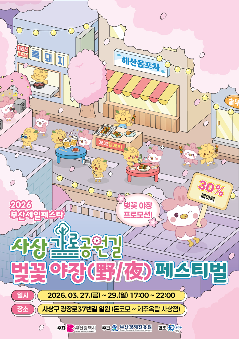 부산에서는 사상 가로공원 벚꽃 야장 페스티벌이 3월 27일부터 29일까지 개최됩니다. 행사 기간 동안 거리 전체가 차량 통제되어 ‘차 없는 거리’로 운영되며, 벚꽃 아래에서 먹거리와 공연을 즐길 수 있는 특별한 경험을 제공합니다. 특히 야간 벚꽃 터널과 콘서트, SNS 이벤트가 어우러져 젊은 층에게 큰 인기를 끌 것으로 기대됩니다.