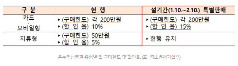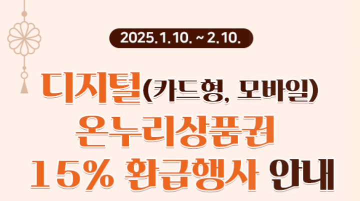 정부는 설 명절을 맞아 소비 촉진과 전통시장 활성화를 위해 온누리상품권 할인 행사를 진행합니다. 디지털 온누리상품권의 할인율은 기존 10%에서 15%로 상향되었으며, 이를 통해 보다 많은 소비자들이 혜택을 누릴 수 있도록 했습니다. 이번 행사는 1월 10일부터 2월 10일까지 한 달간 진행됩니다.