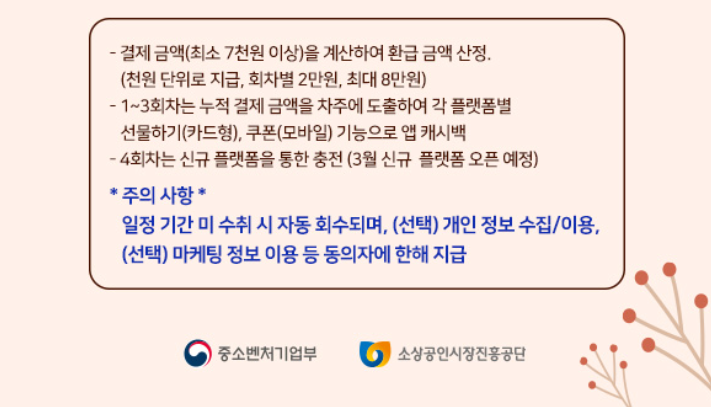 환급은 총 4회에 걸쳐 진행됩니다. 회차별로 카드형과 모바일형 각각 누적 결제액 기준으로 1인당 최대 2만 원까지 환급이 가능합니다. 결제 금액의 15%를 기준으로 1000원 단위로 환급되며, 환급을 위한 최소 결제 금액은 7000원입니다.