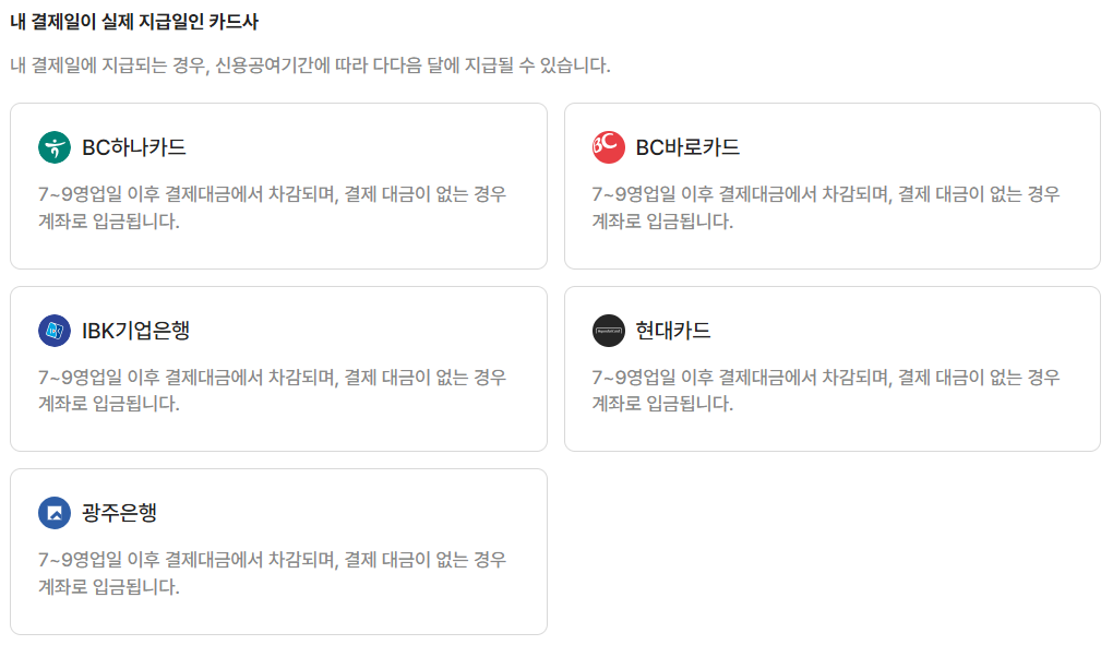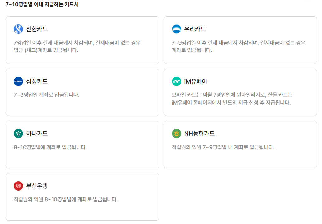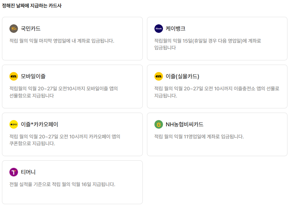 적립된 금액은 주로 적립 월의 익월 7영업일에 카드사로 지급 요청이 이루어집니다. 이는 이용자들이 적립된 금액을 신속하게 활용할 수 있도록 하기 위한 조치입니다. 다만 카드사별로 상이할 수 있으니 확인 부탁드립니다.