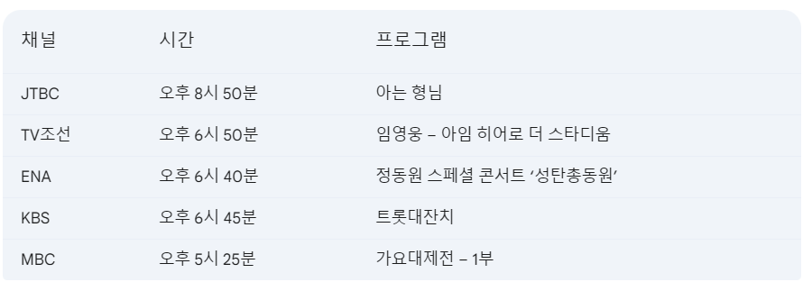 29일 오후 6시 50분에는 임영웅 – 아임 히어로 더 스타디움이 방송됩니다. 지난해 5월 상암 월드컵경기장에서 열린 임영웅의 단독공연 실황을 담은 이 프로그램은 지난해 8월 영화로 개봉한 후 누적 관객 35만 명을 기록하였습니다. 방송에서는 생생한 밴드사운드를 더한 초호화 무대 연출과 임영웅의 다양한 무대 퍼포먼스, 준비 과정 등이 다시 한번 조명될 예정입니다.
