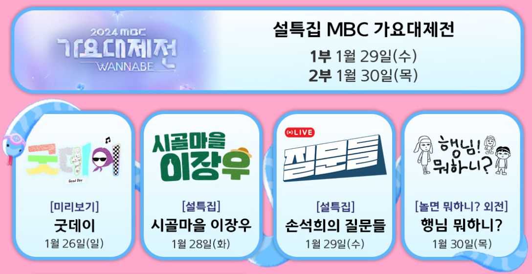 MBC는 다양한 설특집 프로그램을 선보입니다. 29일과 30일 연달아 오후 5시 25분에는 가요대제전이 방송됩니다. 이날 ‘가요대제전’에서는 K팝 워너비들이 한 자리에 모여 선물 같은 시간을 선사할 것입니다. ‘워너비’ 주제에 맞게 후배 아티스트들의 롤모델 소녀시대 윤아와 샤이니 민호, 그리고 5세대 아이돌 투어스 도훈이 MC로 발탁되었습니다. 이 외에도 에스파, 에이티즈, 보이넥스트도어, 데이식스, 있지, 아이브, NCT 127, NCT 드림, NCT 위시, 뉴진스, 라이즈, (여자)아이들 등이 출연하여 무대를 꾸밀 예정입니다.