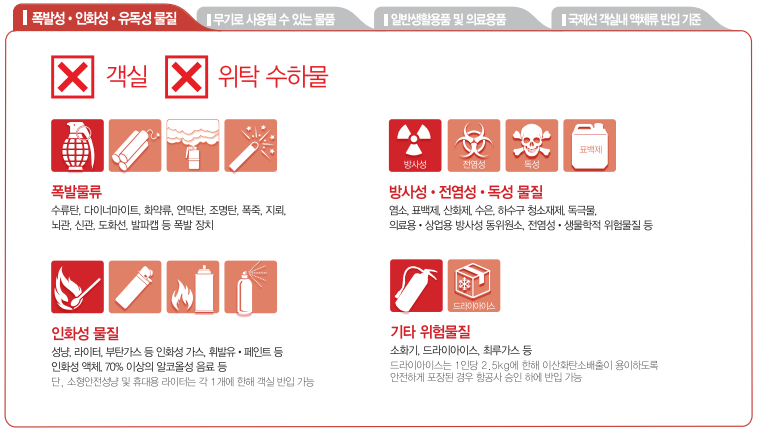 - 기타: 자가 방어용 스프레이 (페퍼 스프레이 등), 특정 전자기기 (예: 드론)