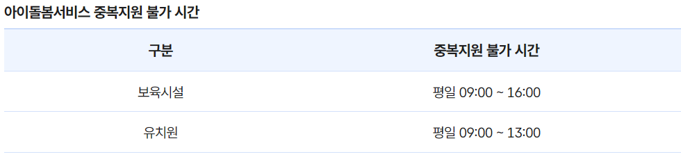 원활한 서비스 제공 및 정부지원의 중복 수혜 방지를 위해 아이돌봄서비스 이용이 제한될 수 있습니다. 보육료 및 유아학비, 부모급여, 영아수당, 양육수당(농어촌 양육수당 포함), 시간제 아이돌봄 지원 아동은 영아종일제 중복지원이 불가합니다. 또한 보육료 및 유아학비를 지원받는 아동의 경우 보육시설 및 유치원 이용 시간에는 정부 지원이 불가합니다.