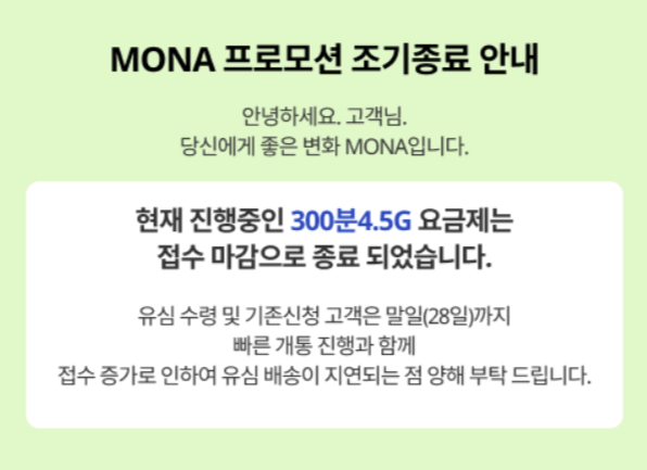 이러한 요금제는 무약정으로 제공되어 중도 해지 시 위약금이 발생하지 않습니다. 다만, 가입 신청자가 많을 경우 프로모션이 조기 종료될 수 있으니 서둘러 확인하시기 바랍니다. 현재 모나 300분 4.5G 요금제는 접수 마감으로 종료되었습니다.