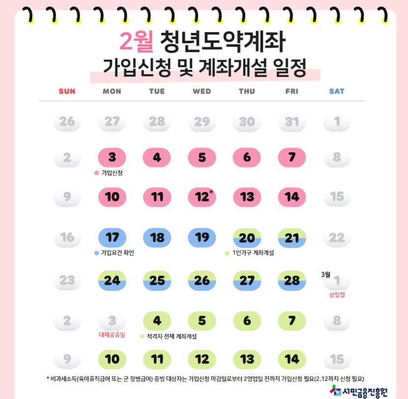 2월 가입대상으로 안내 받은 1인 가구는 2월20일~3월14일에, 2인 이상 가구는 3월4일~14일에 계좌를 개설(영업일만 가능)할 수 있습니다.