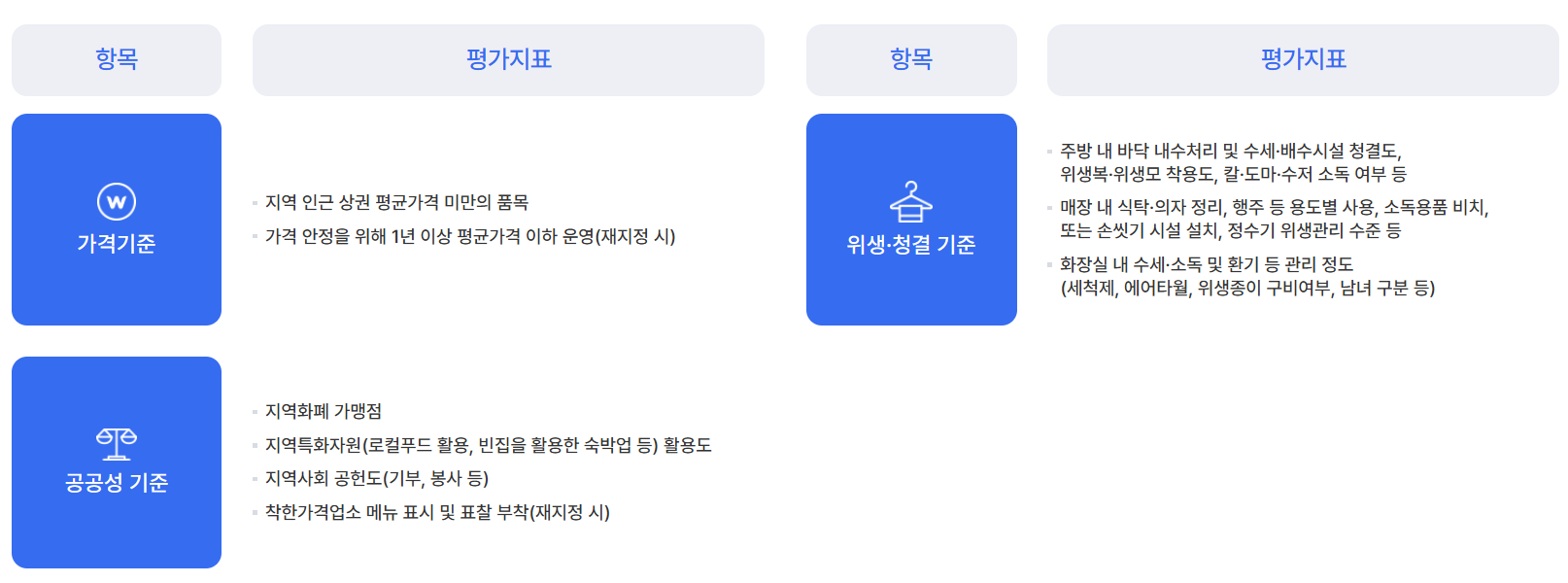 가격이 저렴하다고 해서 서비스의 질이 낮아서는 안 됩니다. 따라서 착한가격업소는 일정 수준 이상의 서비스 품질을 유지해야 하며, 고객 만족도를 고려한 운영을 해야 합니다. 위생 상태, 친절한 응대, 시설 관리 등이 평가 항목에 포함됩니다.