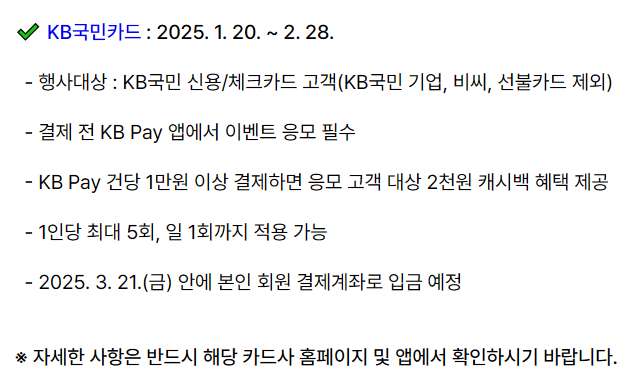 예를 들어, 2월에는 KB국민 신용·체크카드가 참여하며, 3월에는 다른 카드사가 추가될 예정입니다. 단, 할인 한도는 카드사별로 상이할 수 있으므로 이용 전에 확인하는 것이 중요합니다. 할인 적용 여부는 착한가격업소 공식 누리집에서 확인할 수 있습니다.