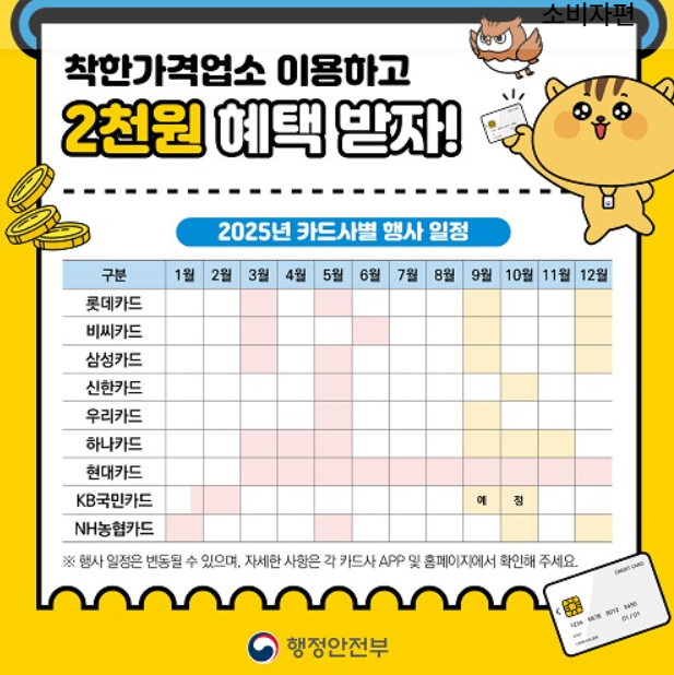 2025년 2월부터 착한가격업소에서 1만 원 이상 카드 결제 시 2천 원의 할인 혜택이 제공됩니다. 이 할인 혜택은 정부와 카드사가 협력하여 지원하는 방식으로, 매월 참여하는 카드사가 다르게 적용됩니다.