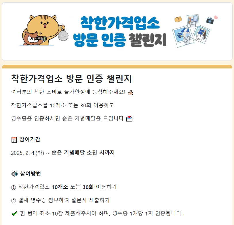 착한가격업소를 방문하여 일정 금액 이상을 소비하면 도장을 받을 수 있으며, 일정 개수 이상의 도장을 모으면 상품권이나 할인 쿠폰을 받을 수 있는 이벤트도 진행 중입니다. 이는 소비자들이 다양한 착한가격업소를 체험하고, 지속적으로 이용할 수 있도록 유도하는 효과가 있습니다.