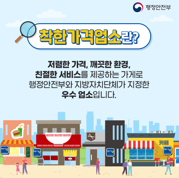 착한가격업소는 행정안전부와 각 지자체가 협력하여 지정하는 물가 안정 모범업소입니다. 가격, 위생, 서비스 수준 등을 종합적으로 평가하여 선정되며, 합리적인 가격으로 서비스를 제공하는 업소를 인증하는 제도입니다. 착한가격업소는 2011년부터 운영되어 왔으며, 현재 전국적으로 수천 개의 업소가 등록되어 있습니다.