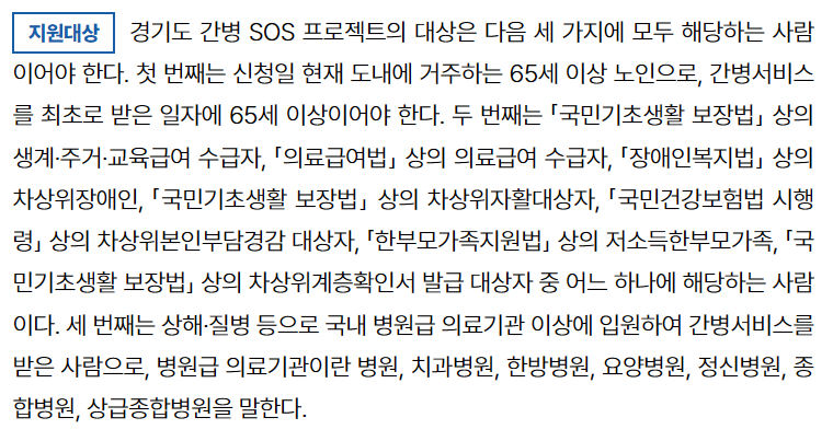 이 프로젝트의 지원 대상은 경기도에 거주하는 65세 이상 노인 중 기초생활수급자 또는 차상위계층에 해당하는 분들입니다. 또한, 상해나 질병으로 인해 병원급 이상의 의료기관에 입원하여 간병 서비스를 받은 경우에 한해 지원이 가능합니다. 지원 대상 여부는 소득 수준, 연령, 거주지, 입원 및 간병 서비스 이용 여부 등을 종합적으로 고려하여 판단됩니다.